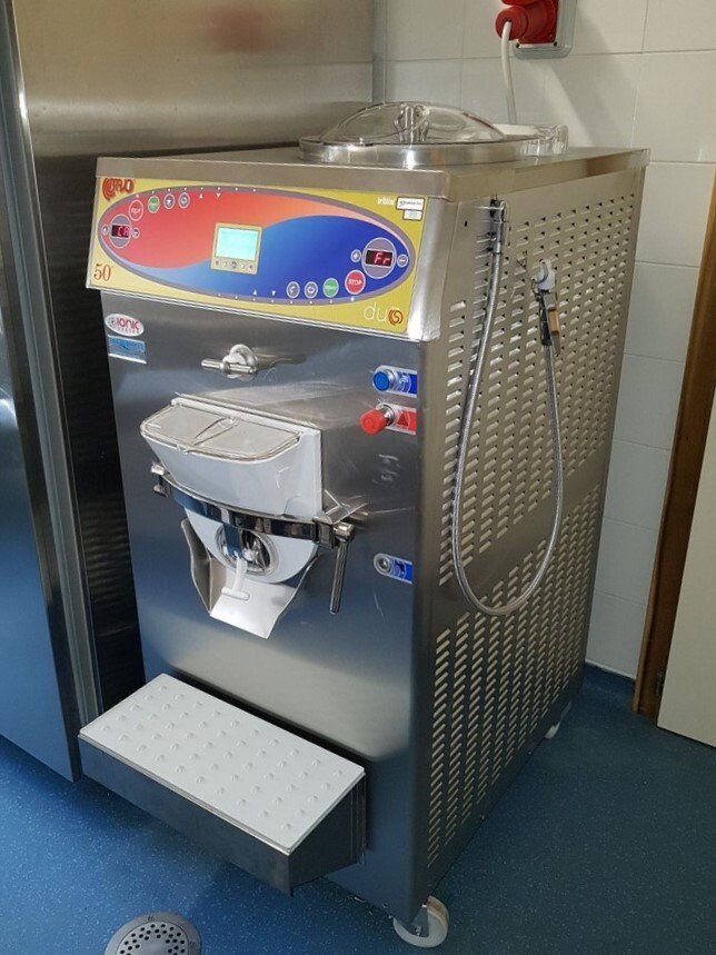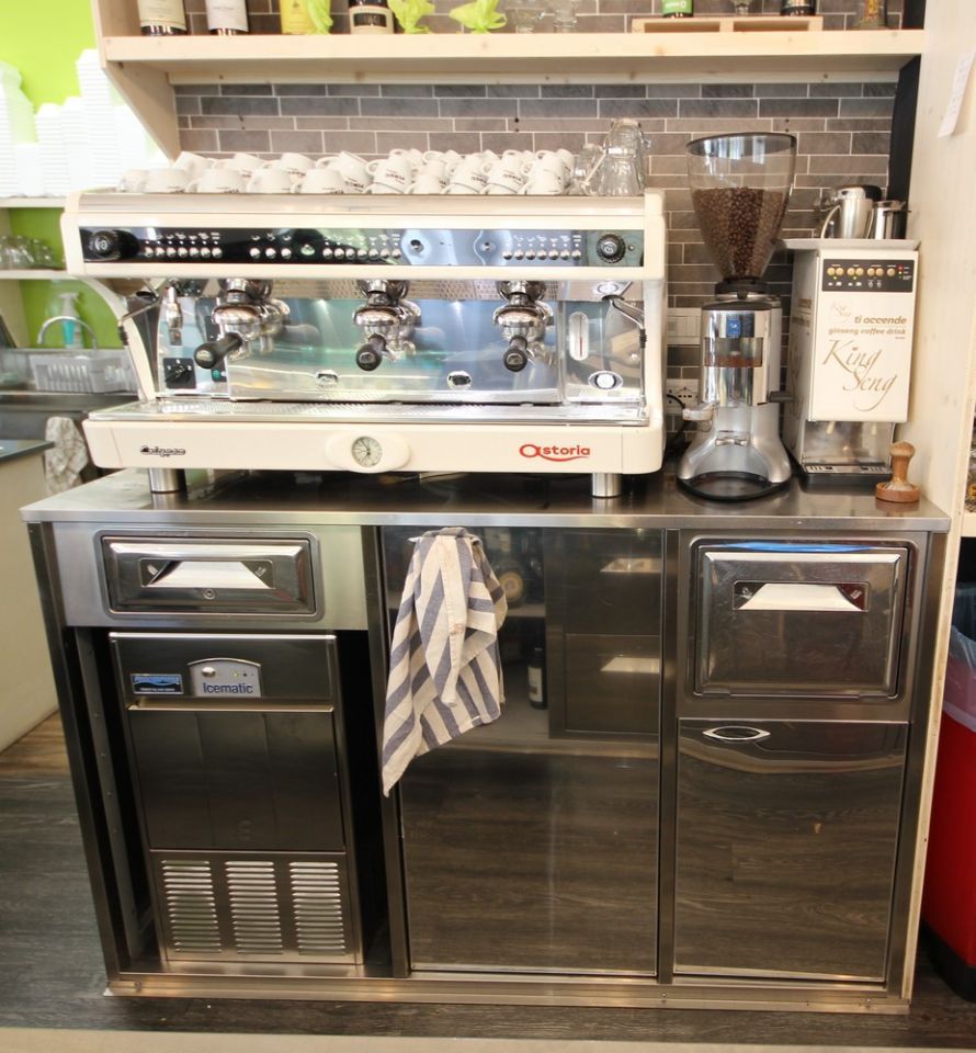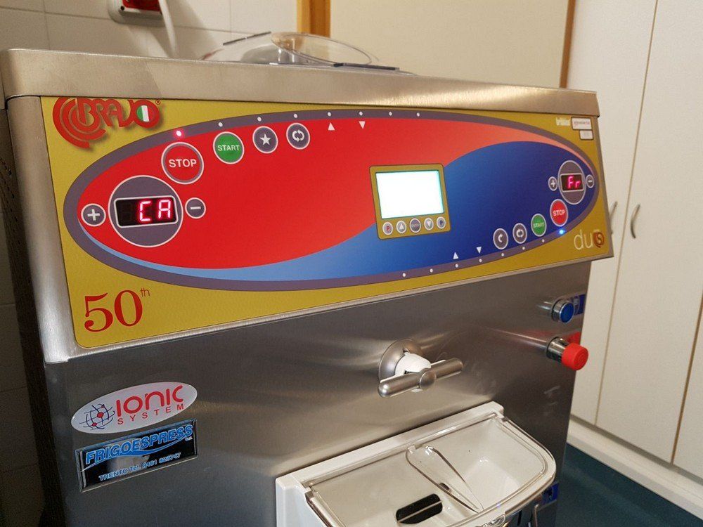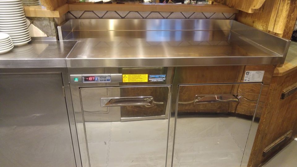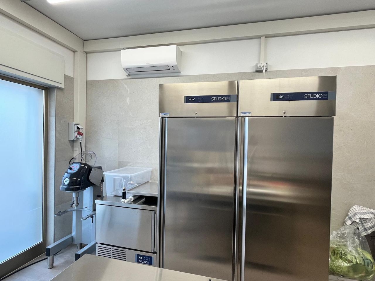 Sull'altro lato un tavolo abbiamo installato una vetrina a pozzetto per la conservazione del gelato. Concludiamo il tutto con tre armadi verticali Mondial e Tecnodom, per la conservazione del prodotto a temperatura negativa e positiva.