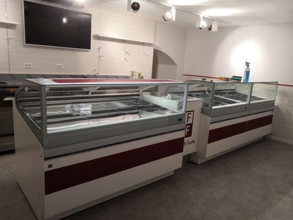 Il punto vendita è stato composto con il retrobanco modulare, mentre nella parte frontale ci sono tre vetrine IFI mod. SAM80, che offrono completa visibilità al prodotto in ogni sua sfaccettatura, sia gelato che pasticceria.