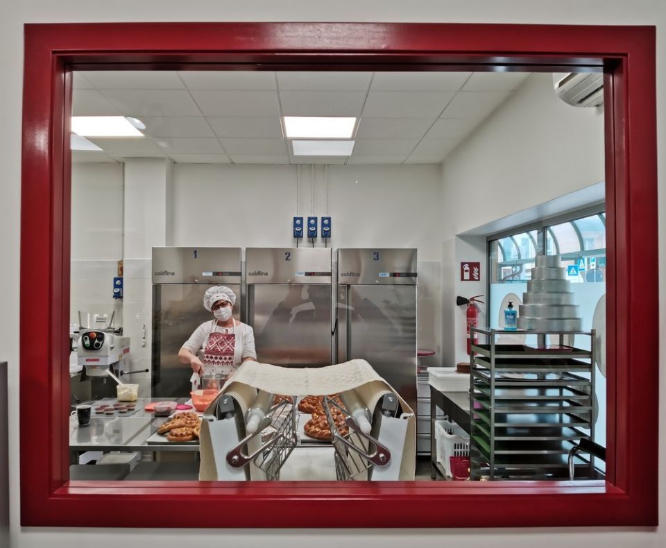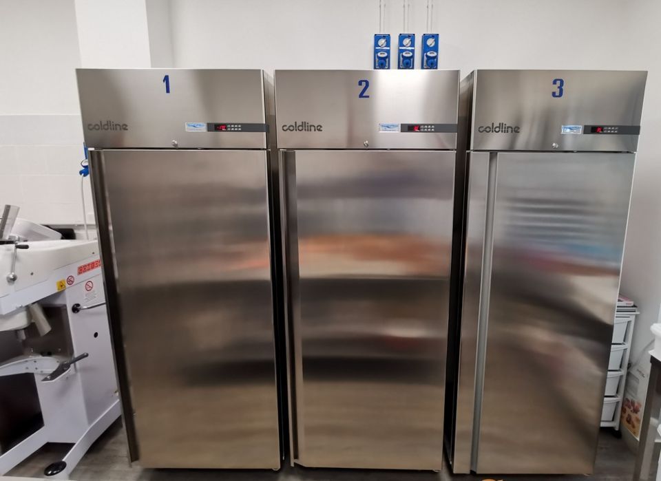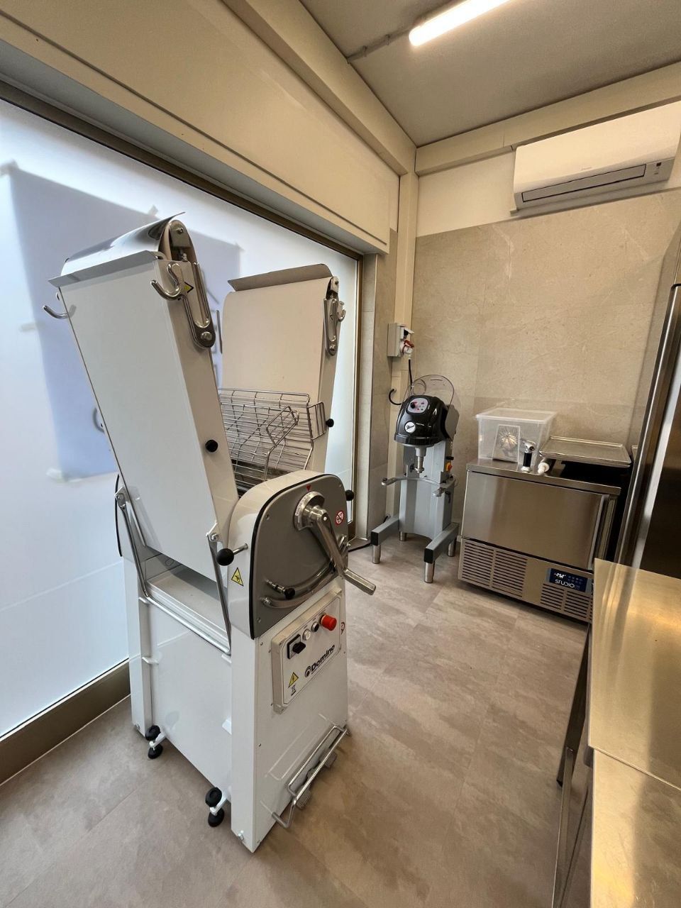 Laboratorio con armadi refrigerati e abbattitore Coldline, per uno stoccaggio perfetto del prodotto, lavastoviglie Krupps con controllo remoto per garantire un’assistenza costante h.24, impastatrice e sfogliatrice Zanolli