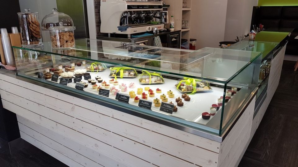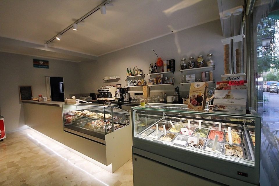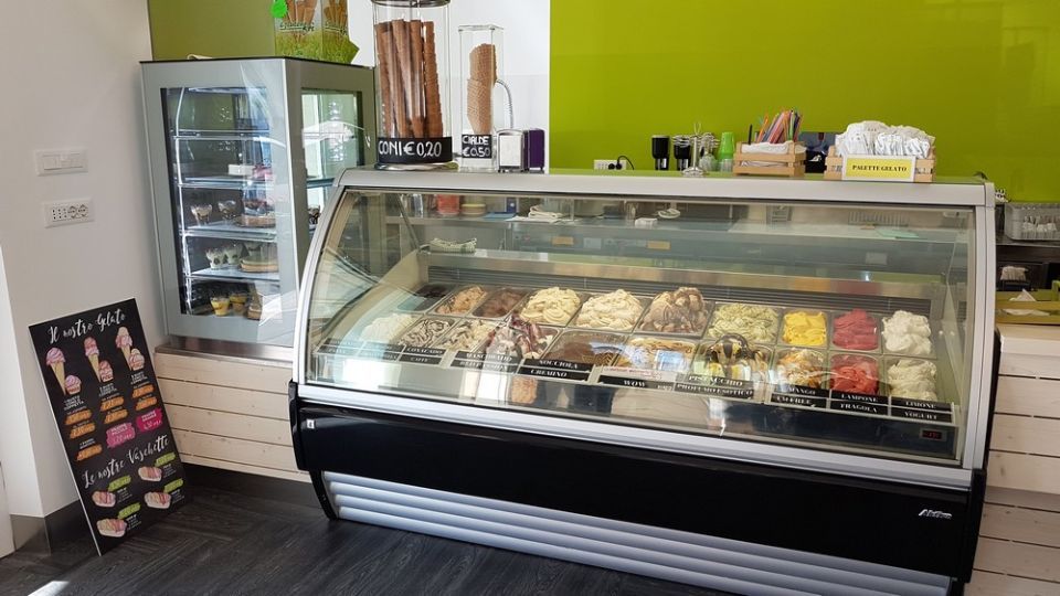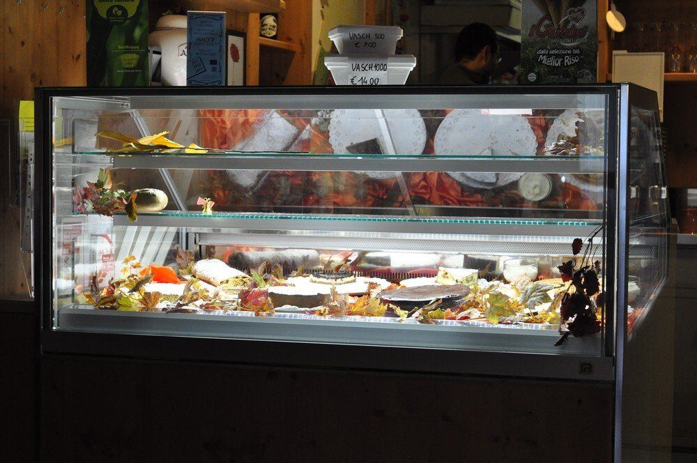 Una vetrina gelateria con settore specifico per semifreddi e una pasticceria.