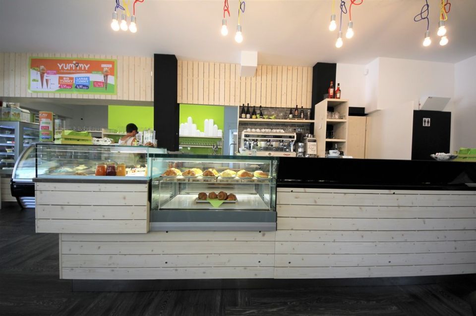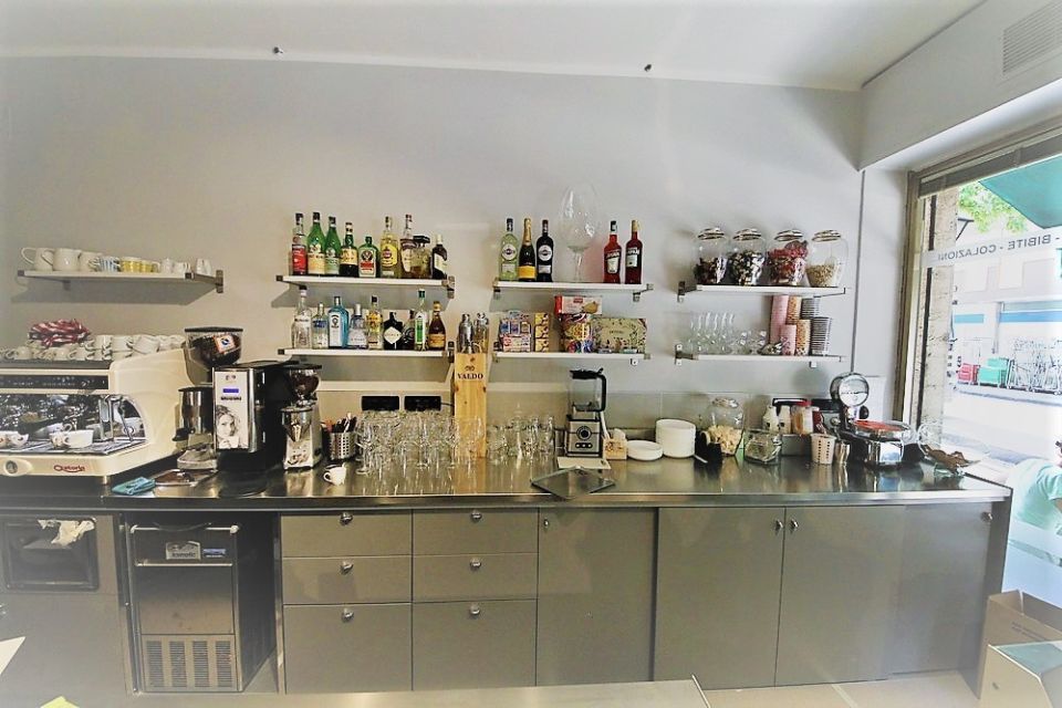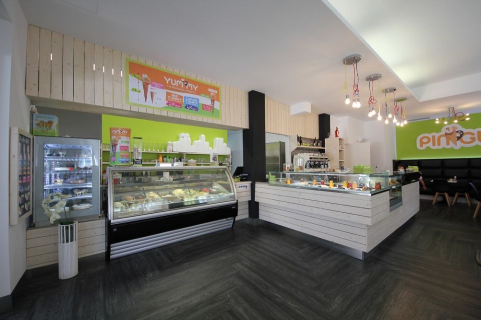 Ampliamento locale gelateria Pingu a Gardolo con inserimento nuova vetrina a angolo IFI, retrobanco caffè e preparazione coppe, zona cucina con lavello, vetrinetta ingrediente, affettatrice e armadio refrigerato.