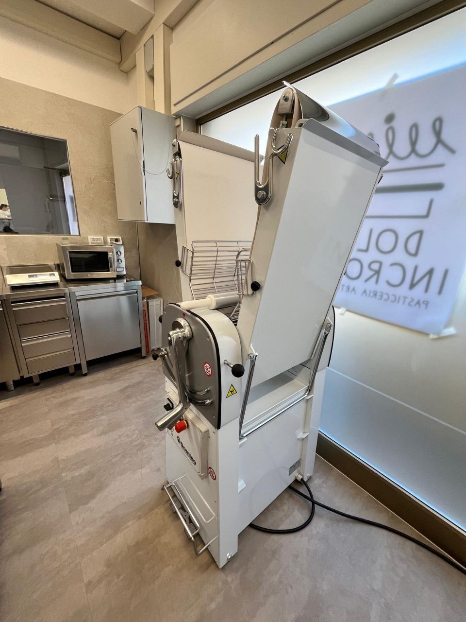 installazione nuove attrezzature per laboratorio di pasticceria presso Dolce Incrocio con forno Unox Ovens, elementi refrigeranti, fermalievita e abbattitore Studio 54, sfogliatrice Domino, impastatrice Steno, tavoli e lavello in acciaio inox Mittel, lavastoviglie per teglie Krupps e vetrina espositiva Ifi.